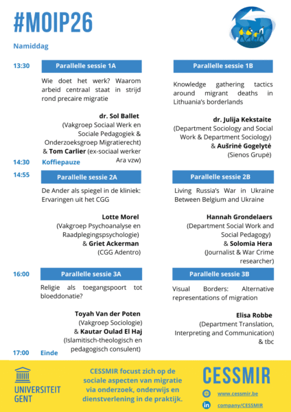 We starten de dag met een lezing van CESSMIR lid dr. Marlies Casier met als titel ‘Van hulp bieden naar aanklagen: lessen uit het politieke werk van solidariteitsbewegingen met mensen op de vlucht’. Daarna voorzien we ruimte voor reflectie en gesprek in kleine groepjes. In de namiddag komen een verschillende duo’s van onderzoekers en niet-academische partners aan het woord. Check ons programma, je kiest zelf hoe lang en waaraan je deelneemt. Vergeet niet om u tijdig in te schrijven!