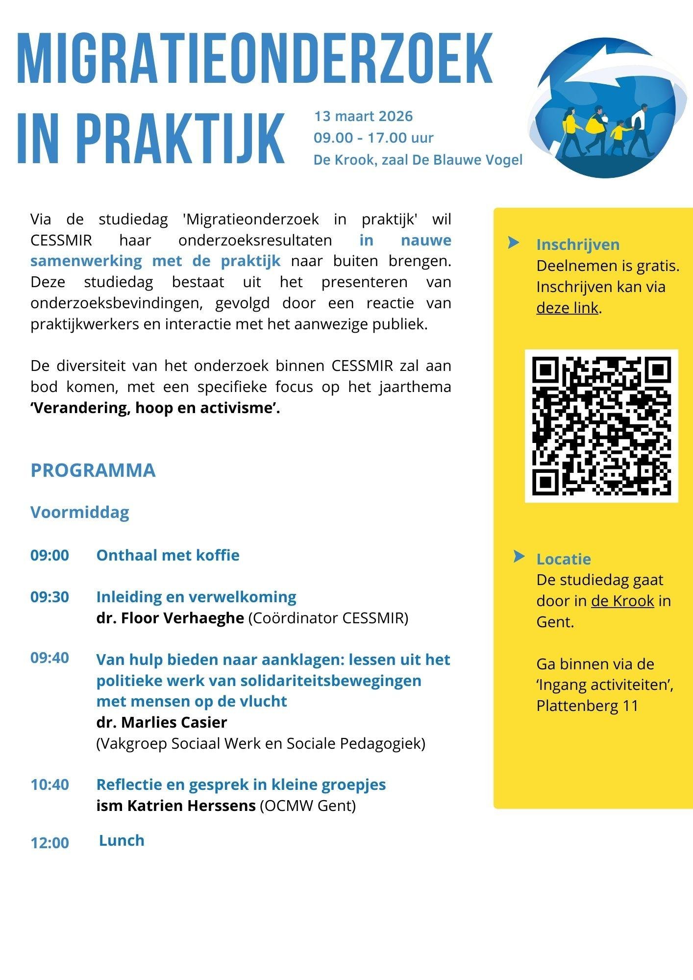 Het interdisciplinaire consortium ‘Centre for the Social Study of Migration and Refugees’ focust zich op de sociale aspecten van migratie en vluchten en zet sterk in op interdisciplinariteit en maatschappelijke impact, in samenwerking met een brede groep niet-academische partners. Via de studiedag wil CESSMIR haar onderzoeksresultaten in nauwe samenwerking met de praktijk naar buiten brengen.