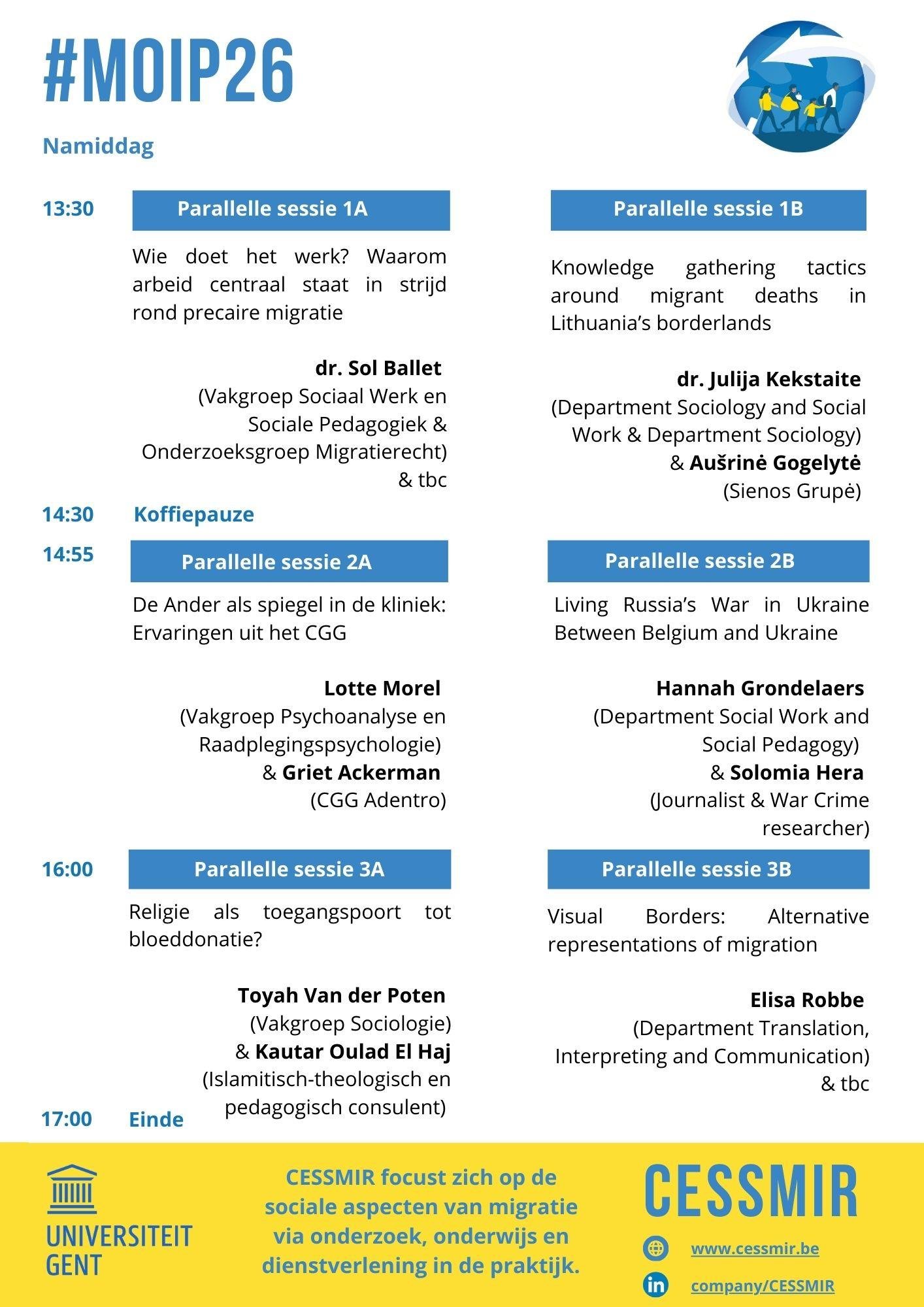 We will start the afternoon with a lecture by CESSMIR member Dr. Marlies Casier entitled ‘Van hulp bieden naar aanklagen: lessen uit het politieke werk van solidariteitsbewegingen met mensen op de vlucht’ (‘From offering help to accusing: lessons from the political work of solidarity movements with people on the run’). Afterwards, we will provide space for reflection and discussion in small groups. In the afternoon, a variety of duos consisting of researchers and non-academic partners will take the floor.